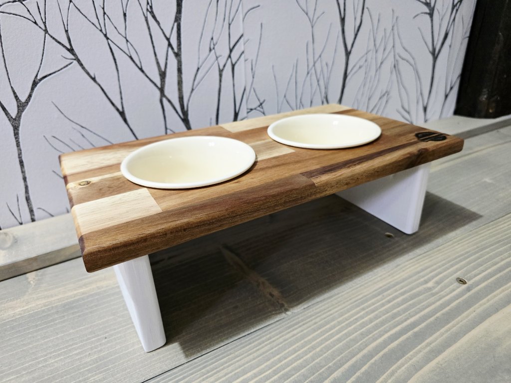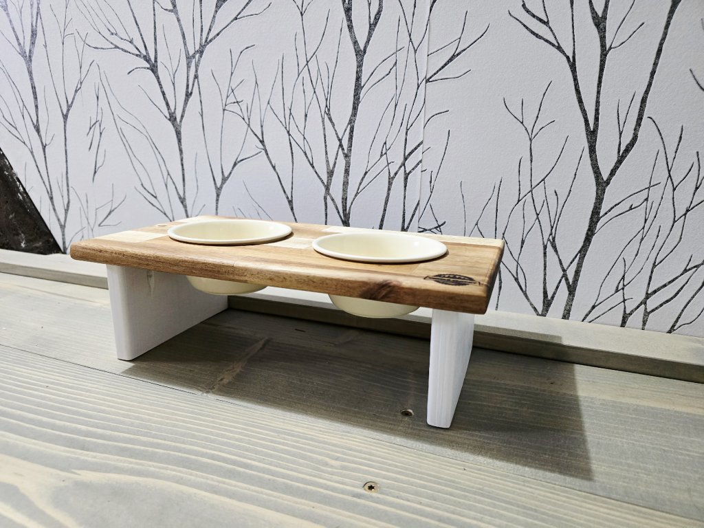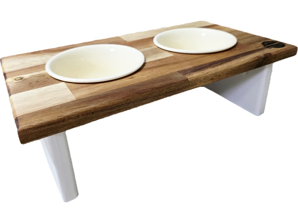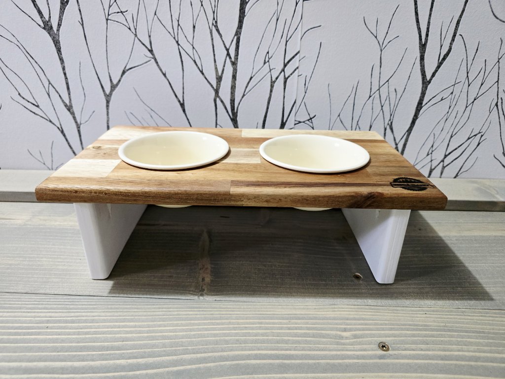 Stylový stojánek splňující veškeré požadavky pro správné krmení vašeho mazlíčka. Pokud si přejete verzi s jiným počtem misek, neváhejte nás kontaktovat pro individuální konfiguraci produktu. Jméno vašeho mazlíčka rádi přidáme zdarma, uveďte v komentáři k objednávce v košíku. Keramické misky jsou součástí balení.
